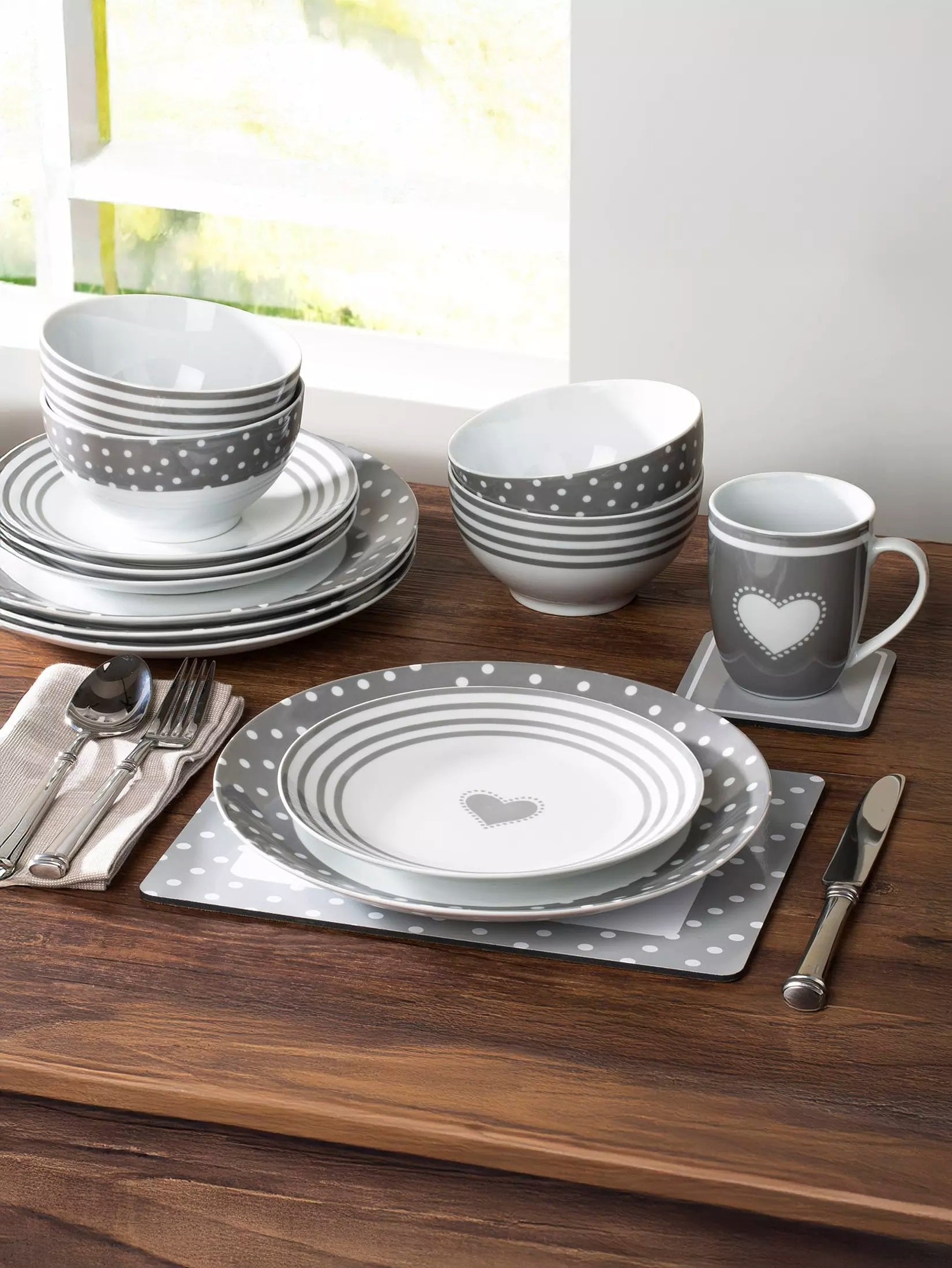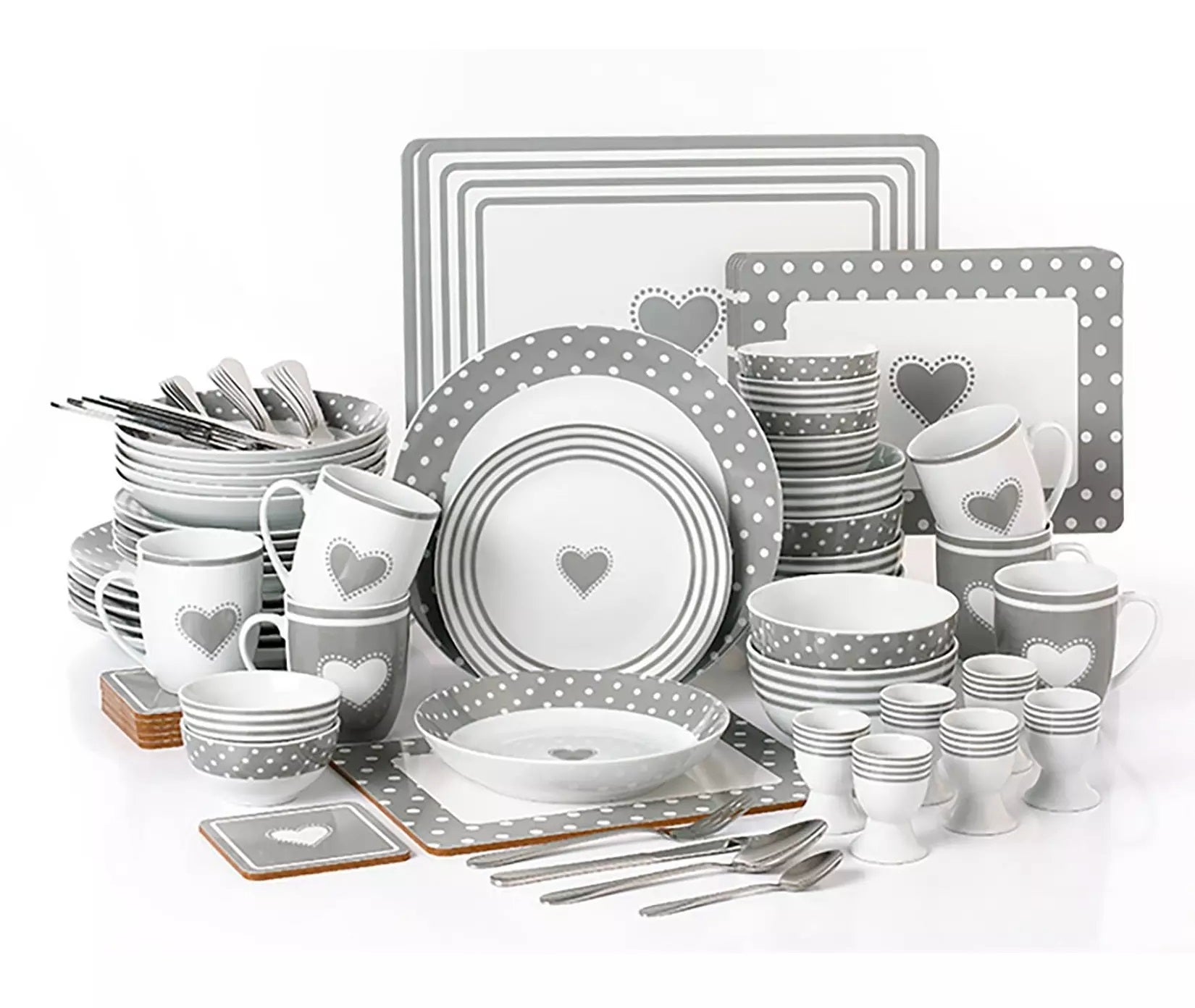 *** BLACK FRIDAY SPECIAL *** Grey Heart Combination Tableware Set; Porcelain, Placemats and Cutlery, 80 Pieces